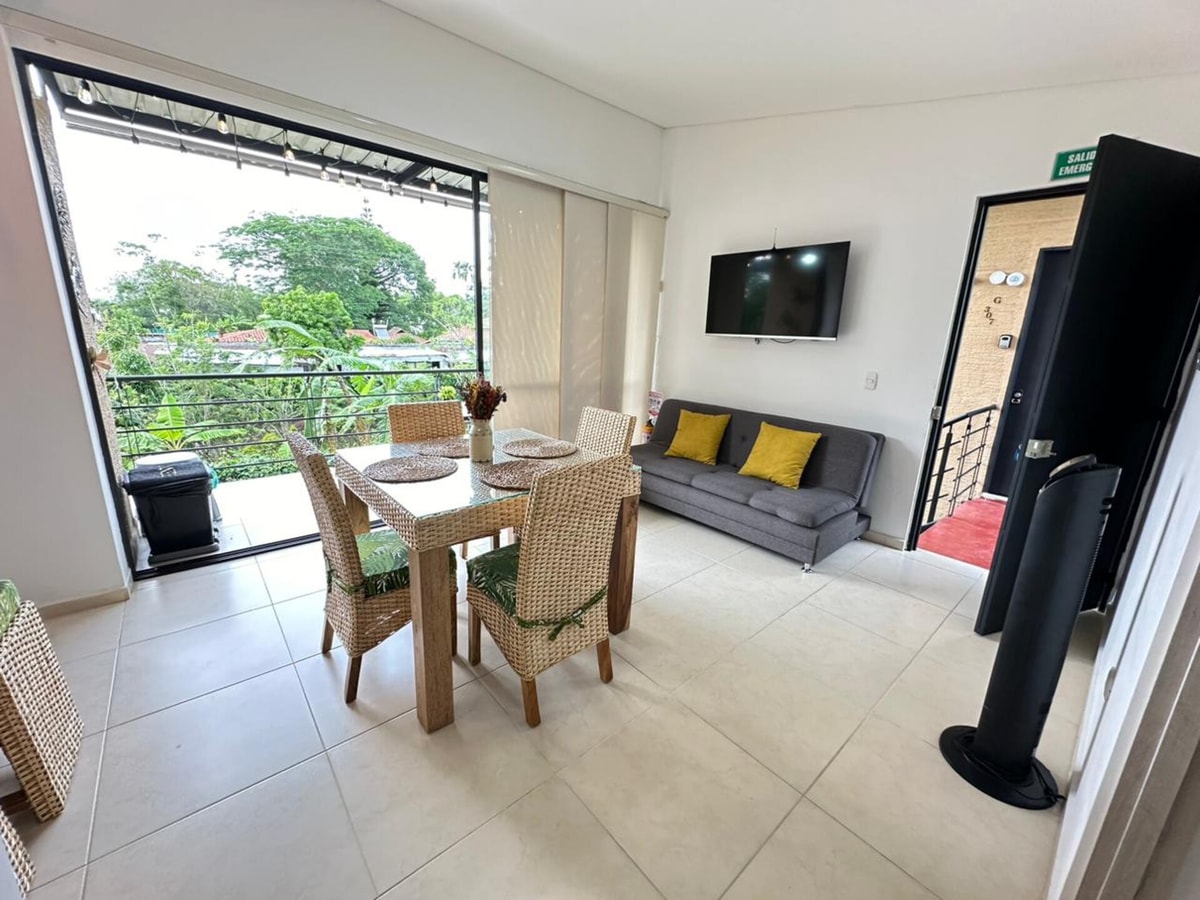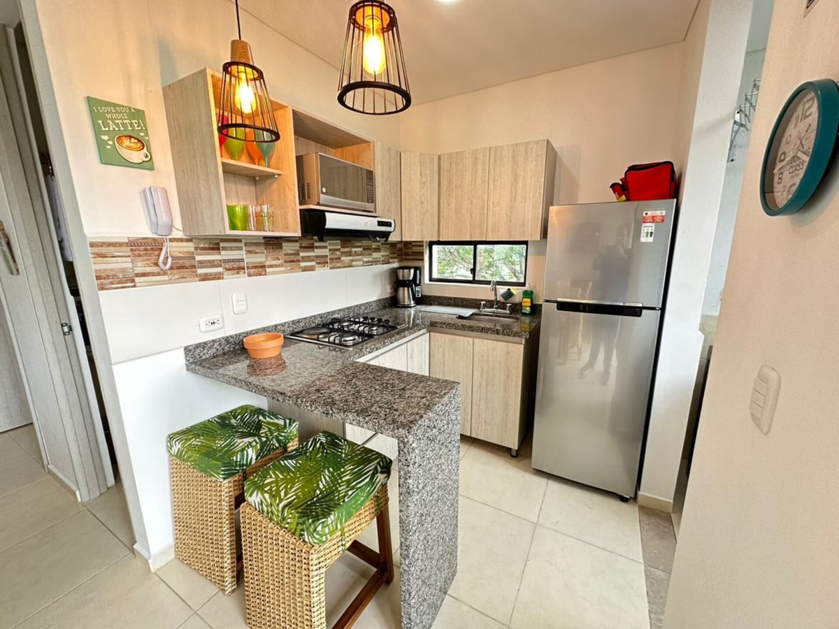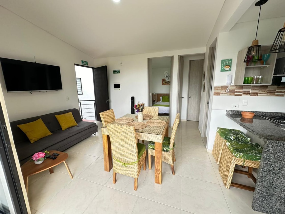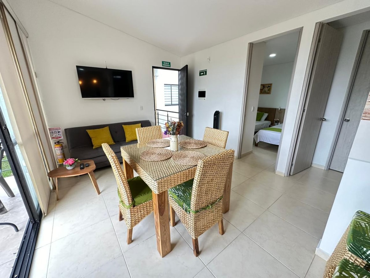 Acogedor apartamento en la Tebaida-Quindío, ubicado cerca al Parque del Café 26 minutos, Panaca, Club Campestre, Mall Paraíso y el Aeropuerto Internacional El Edén. Con capacidad para 6 personas, es ideal para familias o grupos de amigos.