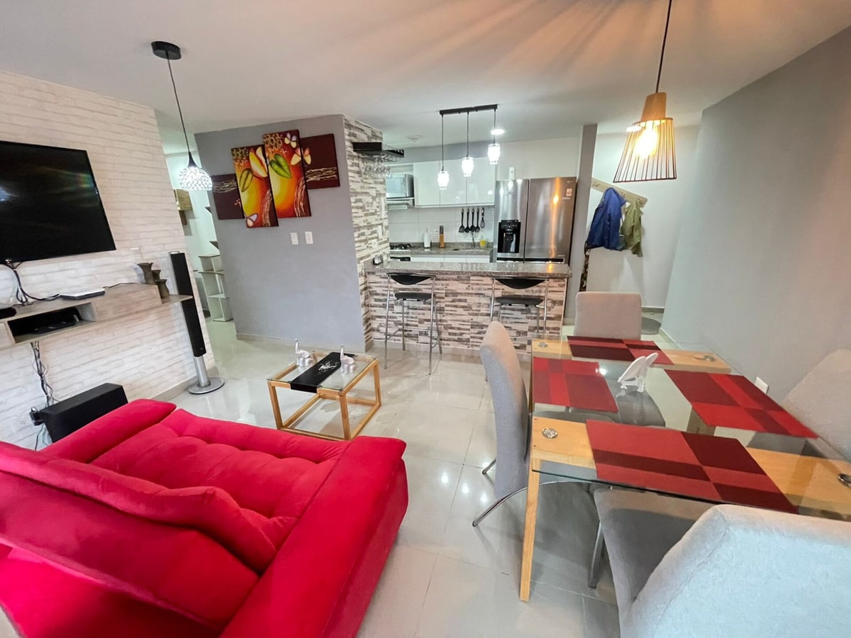 El apartamento cuenta con 2 habitaciones: la principal con cama doble, vestier, TV Smart y baño privado; y la habitación auxiliar con dos camas sencillas, closet y TV. La sala comedor está equipada con TV Smart TV, sistema de sonido, sofá cama, comedor auxiliar, barra con sillas altas y zona de trabajo con dos escritorios. Además, cuenta con balcón, cocina integral y zona de ropas.