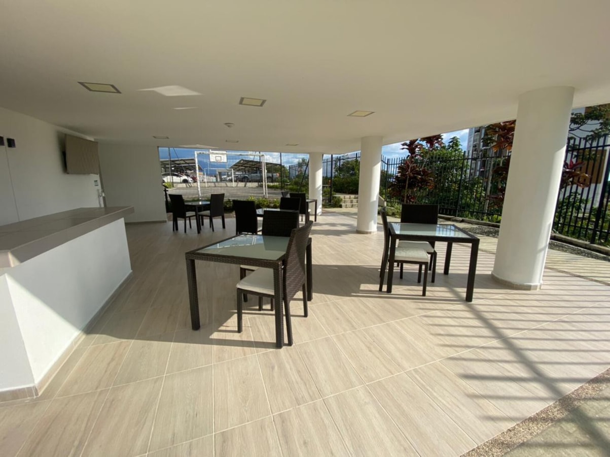 Disfruta de una linda vista hacia las zonas sociales del conjunto y de un parqueadero cubierto para carro. El apartamento está 100% dotado con implementos de cocina y amoblado, incluyendo nevera, lavadora y comedor auxiliar en el balcón.