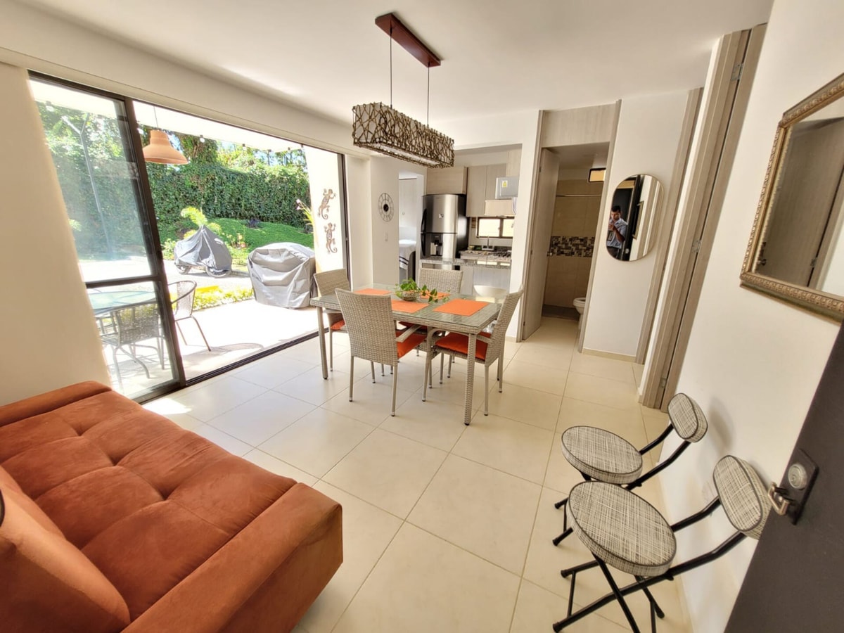 100% dotado con implementos de cocina y amoblado, con nevera, lavadora, comedor, microondas, cafetera y más.