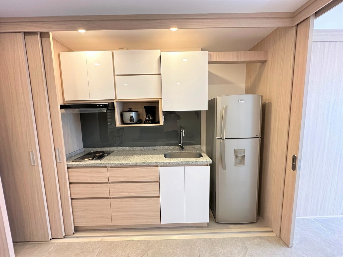Nuestro apartaestudio está 100% dotado y amoblado, ideal para hospedarse hasta 3 personas. A continuación, te detallamos sus características: