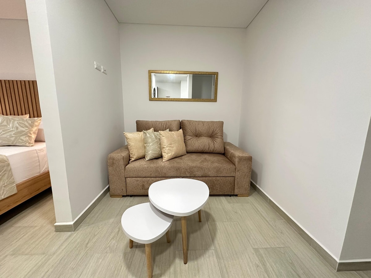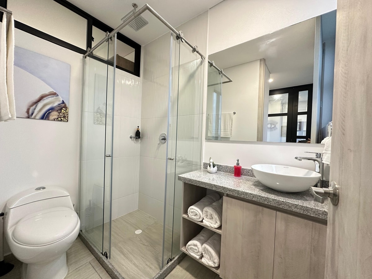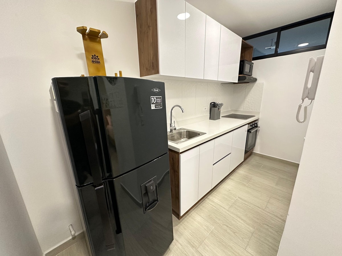 El apartamento está 100% dotado con implementos de cocina y amoblado, incluyendo nevera . Además, el conjunto residencial cuenta con recepción, vigilancia y portería 24/7, y ascensor.